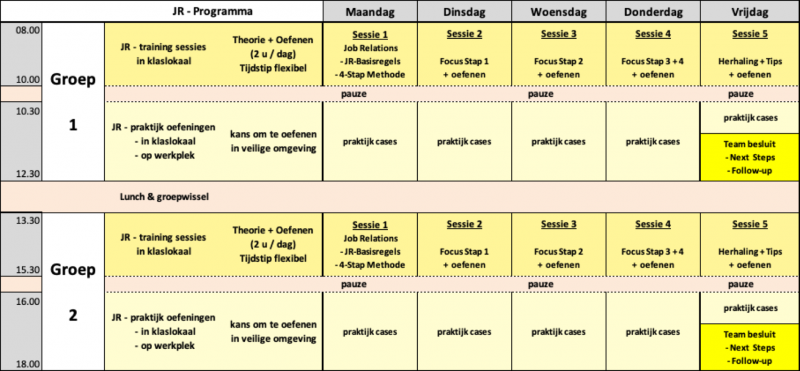 De JR training duurt meestal 5 dagen en bestaat uit 2 trainingsgroepen van elk 10 deelnemers (een groep in de ochtend en een groep in de middag).